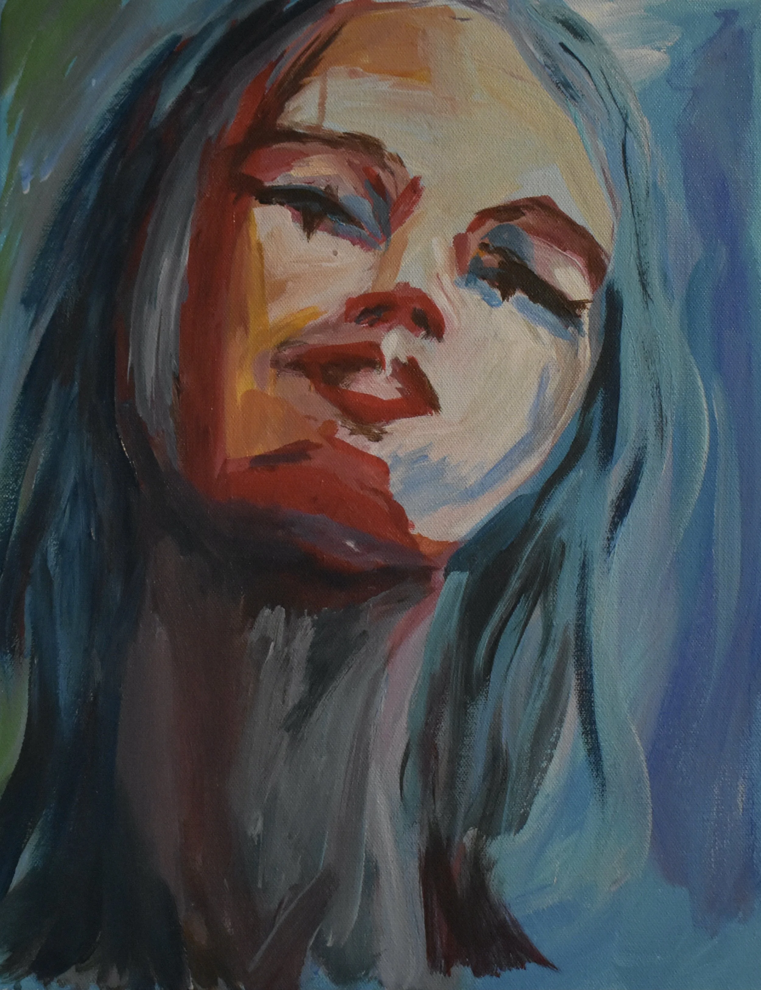 Artist Statement: A show of the stressing environment of school from the perspective of a student separated from their friends who are focused on their own work. Bold and muted colors mix to create the show of contours of people and their environment.