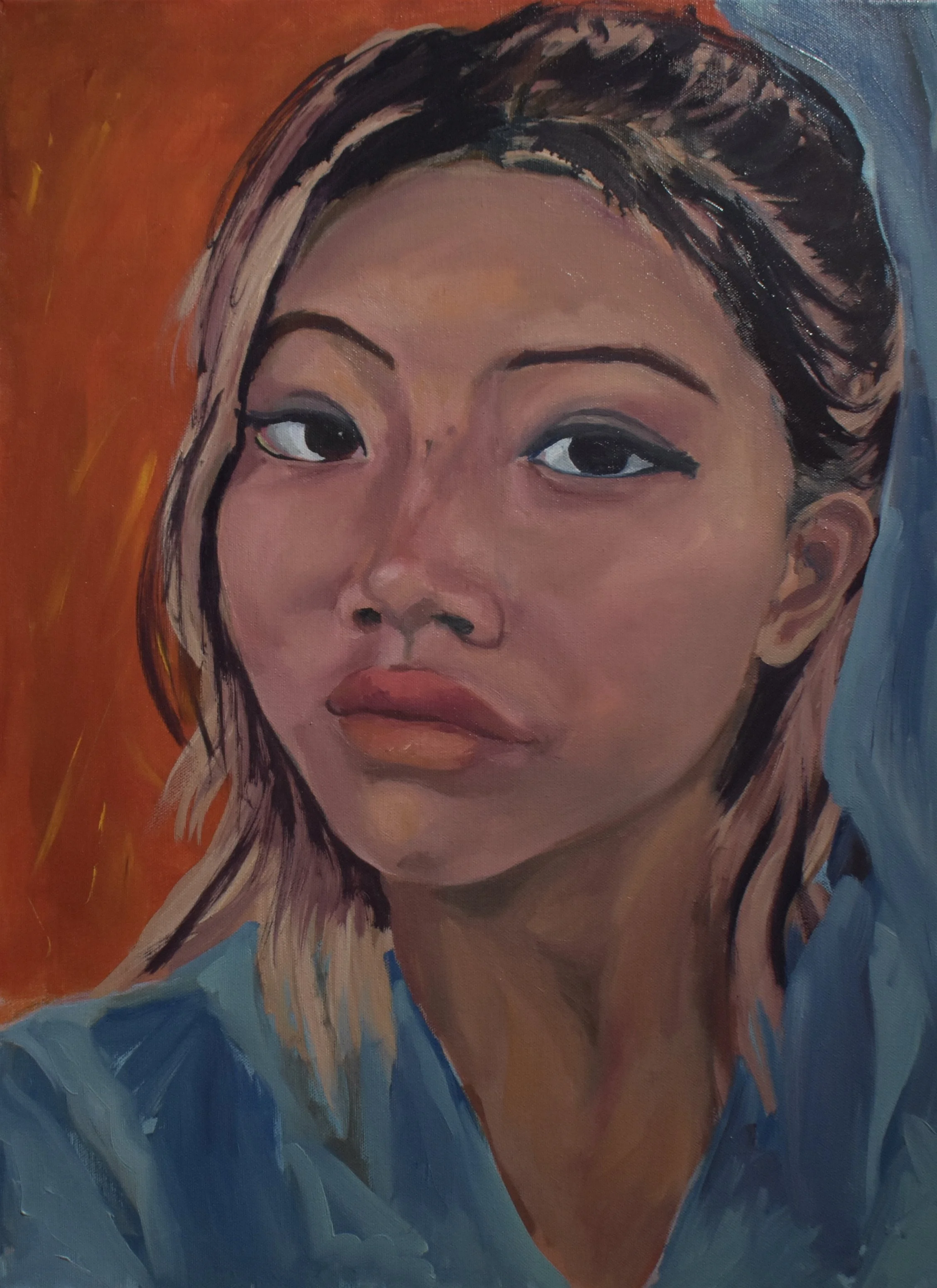 Artist Statement: It's been a drab year with the pandemic and all the issues going on in the United States as well as the rest of the world. And sometimes it feels like everything is going wrong and just when something is going right, or you feel like you've gotten into a good routine, it all changes again leaving you feeling like there's no light at the end of the tunnel. I wanted this piece to symbolize the strength and persistence we have all gained throughout this time. The subject of the painting is in a black suit and wearing a freaky black gasmask, and they're surrounded by these bold, colorful blooms. I think that the person really represents the dull and dreariness of the year we've been having, but we still push through by working from home, (perhaps in a black business suit or maybe not..) or exercising, or picking up hobbies. The flowers in the background remind me of the idea that there are good parts of even the most horrible of situations and it's all about they way you want to look at things. Also, everything passes and we must be stronger than we think we are.