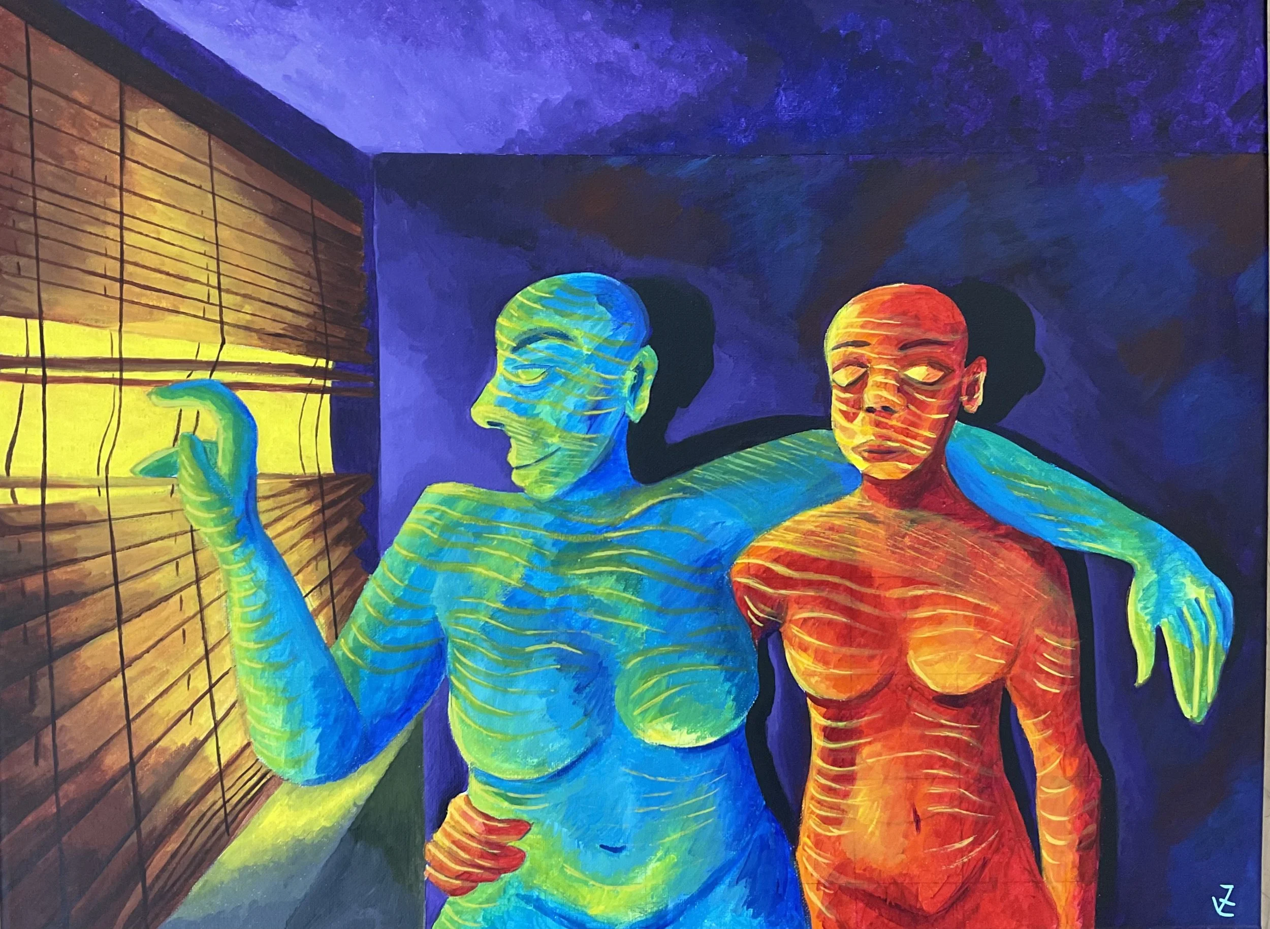 Artwork Description: This piece fits into the theme because two figures are portrayed to be very different from one another. Not only are they different with the use of color, they are also depicted to be different body sizes. I feel it is important to represent bodies of different sizes in forms of art so that we can show that there is no singular body type that should be superior to others, we are all equal and we all have beautiful bodies. I felt it was important to show the two figures holding each other as well, showing physical attraction and a longing to be near each other which also shows their love for one another.