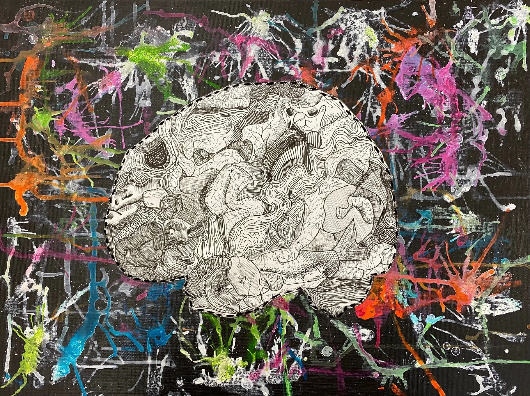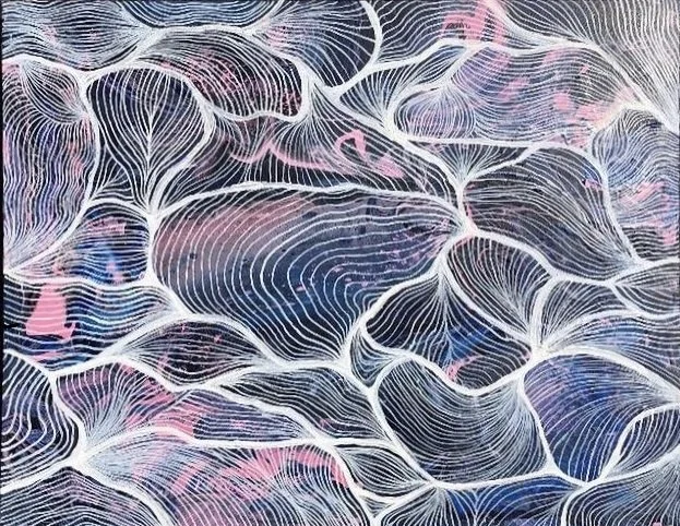 Artwork Description: This artwork was made in high school and was the first painting she did on a somewhat larger scale. The layer of paint pen lines on top is meant to go with the flow of the acrylic pour style underneath it.
