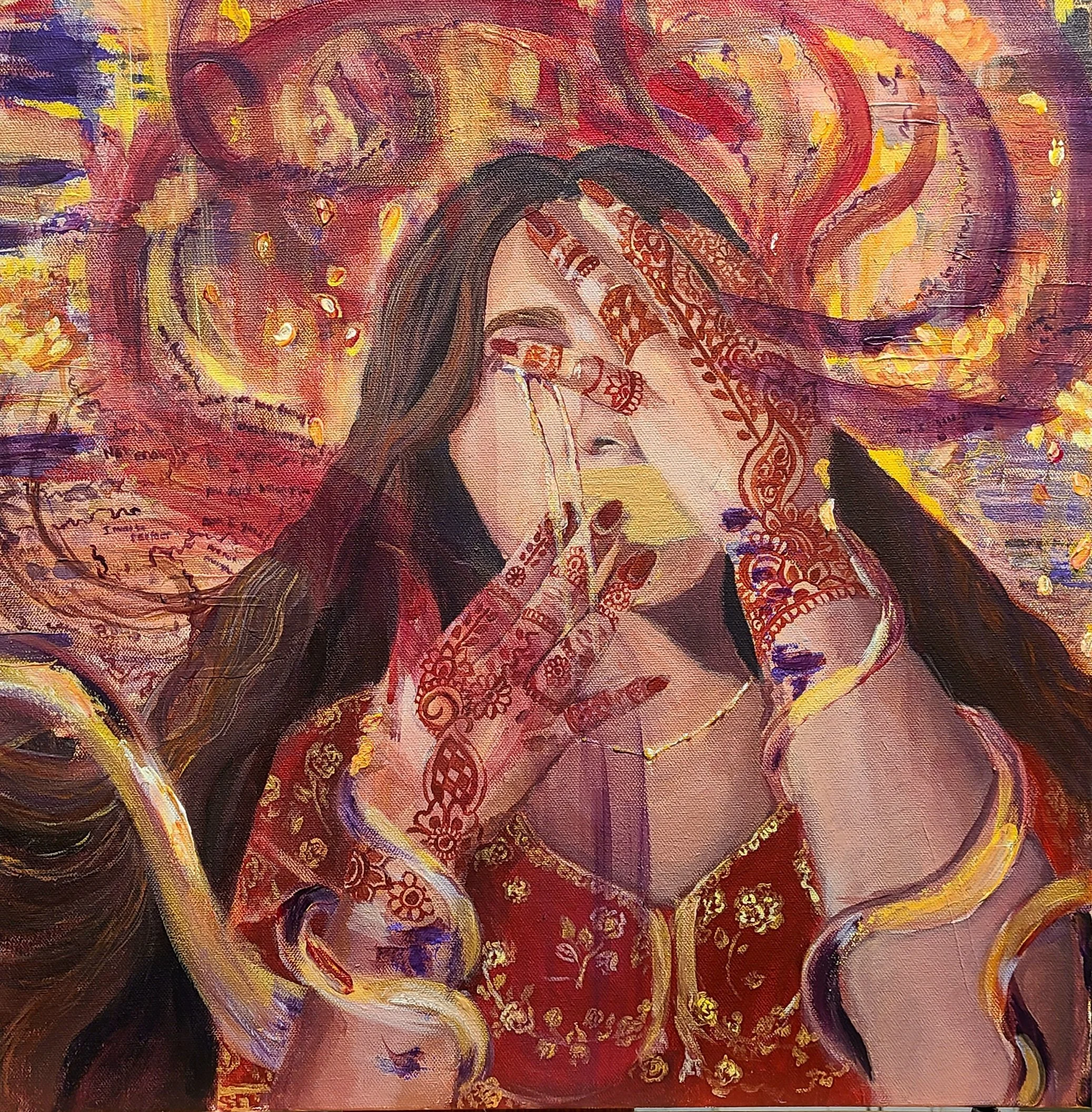 Fractured Expectations is an acrylic painting that explores the cultural pressures placed on women, the burden of constantly trying to meet impossible expectations while feeling like you’re never quite enough. Through bold reds tied to traditional wedding attire and henna, the piece reflects the deep-rooted cultural significance and the weight of roles women are expected to fulfill: to settle down, yet pursue a career, but not just any career, care for others, maintain perfection, but not try to much, all without complaint.