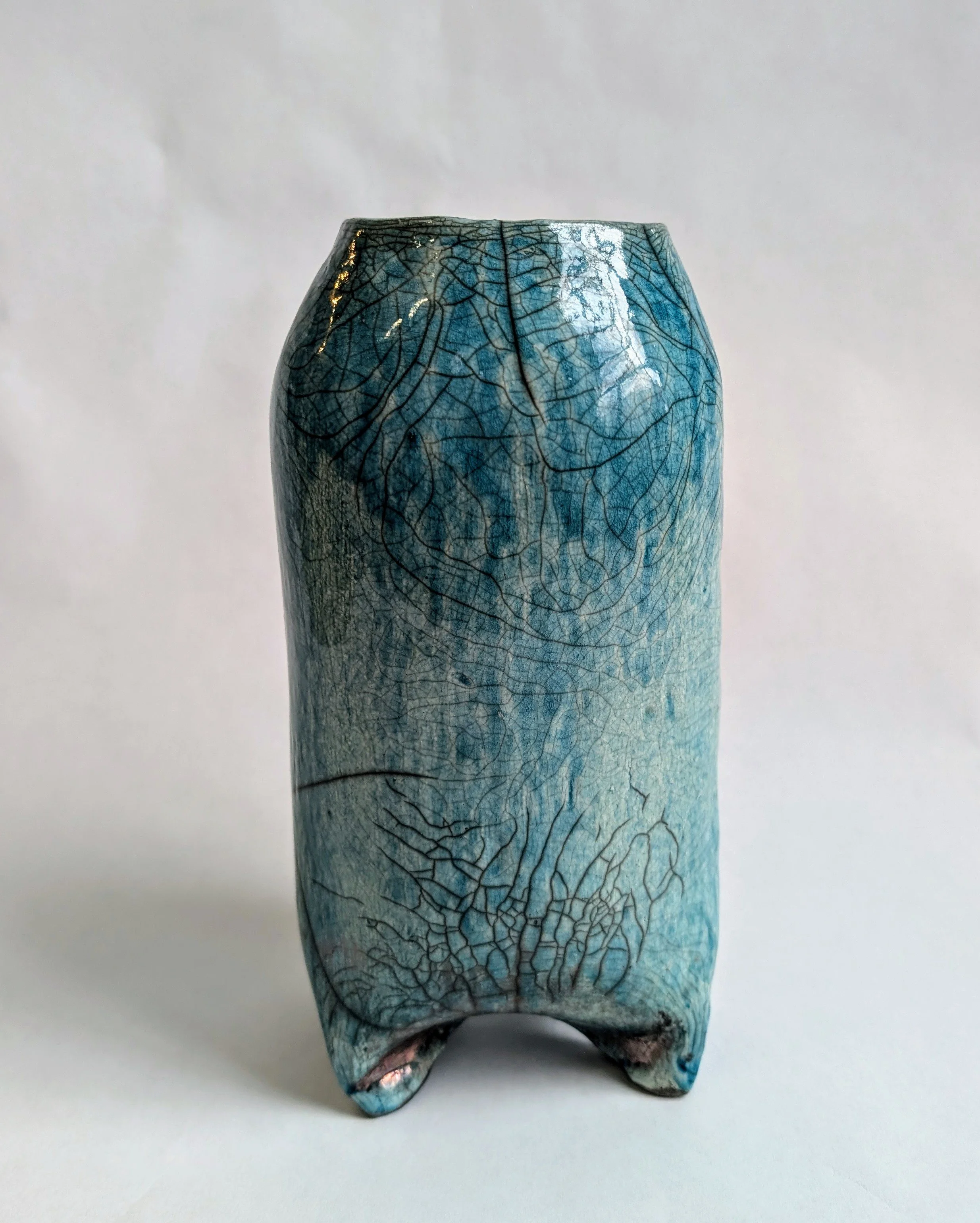 Topaz takes shape through fire and touch, its cracked glaze and shimmering copper details record that process of its creation. Created through Raku firing, the vessel holds the scars of its making, scored seams, pinched feet, and smoke-marked glaze tell the story of change. Embodying how a human hand and elemental force can transform the earth into objects.