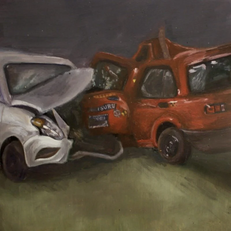 Artist Statement: The crash depicted in this painting serves as a representation of not only a moment of violent destruction but as the endpoint of a long, inevitable process of deterioration. The painting captures that final instant when years of wear become unmistakably visible, turning invisible tension into a twisted, crumpled form.